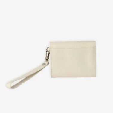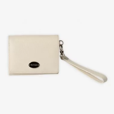 La dragonne amovible permet un porté main pratique, tandis que les finitions métalliques argentées et la doublure en toile monogrammée soulignent le raffinement propre à la maison Mac Douglas.